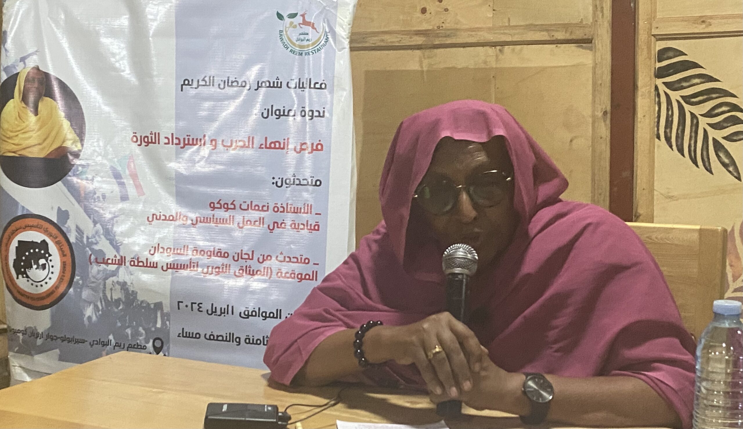 الحركة الإسلامية بداءت حكمها بقتل طبيب وانتهي حكمها بقتل معلم ومشروع الحضارة الإسلامية تضررت منه النساء والشباب اكثر بتجنيد الشباب في الدفاع الشعبي وغيره حتي لايكونوا قوي مقاومة لهم، الصراع الاجتماعي الثقافي الخارج عن الوحدة علي الثوابت الوطنية اضر بالسودان فإرادة الشعب السوداني ستقود الي ايقاف الحرب لامحال.  فاشباب الثورة قدموا أرواحهم فداء للوطن لكن خيانة الثورة بداءت عندما تمت مشاركة اللجنة الأمنية في الفترة الانتقالية ونذكر ان الوثيقة الدستورية نصت ان السودان دولة ديمقراطية مدنية لكن تم التعديل بأن يكون السودان دولة ديمقراطية فقط وهذه الخيانة الكبرى للثورة وكان ممثل المجلس العسكري قائد الجنجويد فما هي خبرته في ما كل ما يناقش. الجيل القادم هو من يمثل إرادة الشعب السوداني، ما يحدث اليوم لايقود لمصلحة السودانيين وهذا تآمر على خط الثورة استند علي قوي اجتماعية خارجية لذلك لايمكن ان تقف الحرب إلا بارادة داخلية وهذه الحرب ليست بين جنرالين بل هي حرب لدمار السودان فقط، اما بخصوص الحكومة الانتقالية ذكرت الاستاذة نعمات كوكو انها لم تعمل في اتجاه حل مشكلة المواطن خصوصاً في الريف وان برامج الفترة الانتقالية لاتخلوا عن برامج النظام البائد برامجها خالية من الواقع المعاش وان اتفاق جوبا لم يكن لصالح النازحين بل هو إتفاق لتحقيق مصالح نخب معيّنة، أما بخصوص هذه الحرب قالت الاستاذة نعمات كوكو في ندوة بعنوان فرص انهاء الحرب واسترداد الثورة التي اقامها مطعم ريم البوادي بكمبالا بتاريخ 01/04/2024 ان هذه الحرب أشعلها النظام البائد وما افطار قائد الجيش قبل بداية الحرب إلا مؤشر علي انطلاقة الحرب لكن الدعم السريع كان جاهز اكثر من النظام البائد لانه كان مدعوم من الإمارات العربية المتحدة وامتلك أسلحة متطورة واستولي علي اماكن استراتيجية داخل الخرطوم حتي داخل القيادة العامة، كما انها اشارت إلى ان ملفات الدولة السودانية لم تكن بأيدي السودانيين بل بالخارج لأنها مرتبطة بمصالح اقتصادية واجتماعية لدول اخري لذلك مبادرة جدة لم تنجح. واضافت ان السودانيين اصحاب إبداء كانوا حراس لثورتهم والان في ظل الحرب بادر عدد من السودانيين بالاتفاق مع الجنجويد على عدم الدخول في مناطقهم والآخرين عملوا غرف طوارئ، فذاكرة السودانيين لم تنسي أفعال الجنجويد في دارفور اكثر من مئتان قرية أحرقت بالكامل واستنكرت الاستاذة نعمات موقف تقدم بتهيئة الوضع لعودة المدنيين لمنازلهم في ظل انتهاكات الجنجويد ولن تقف الحرب لان مصالح هذه الأطراف مرتبطة باستمرار الحرب. واختتمت حديثها أن ارادة الشعب السوداني قادرة علي فرض مصالحها وهزيمة قوي الشر، وذكرت ان الطيران المصري هو من قام بضرب مصانع بحري والتي لم يكن بداخلها عناصر للدعم السريع.