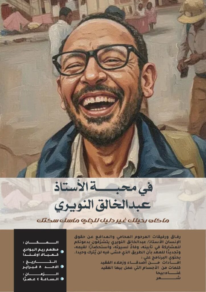 بقلوبٍ مؤمنة بقضاء الله، ومفعمة بمشاعر الوفاء لروحٍ فارقتنا جسداً وبقيت فينا أثراً، يدعوكم رفاق وأصدقاء الراحل المقيم، الأستاذ عبدالخالق النويري، لحضور يوم تأبينه؛ احتفاءً بمسيرةٍ حافلة جمعت بين رقة الشاعر الذي طوع الحرف، وجسارة المحامي الذي لم يخشَ في الحق لومة لائم، ونبل المدافع الذي جعل من حقوق الإنسان قضية وجود.