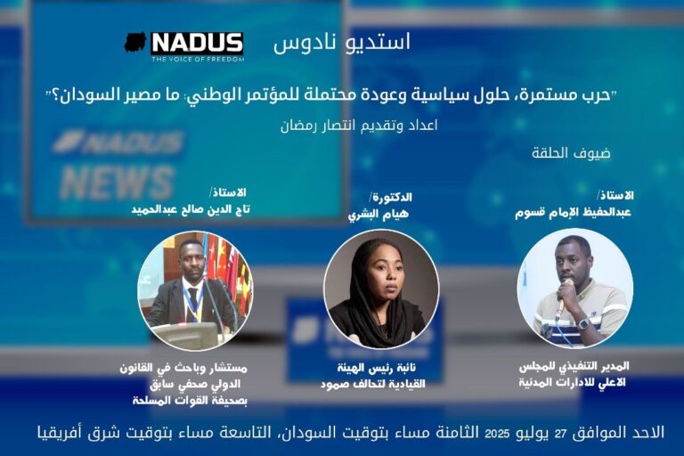 في حلقة حوارية مثيرة من برنامج “#استديونادوس”، تلتقيكم الاستاذة/#إنتصاررمضان مع نخبة من الشباب الخبراء والسياسيين السودانيين ليناقشوا الأزمة السودانية من جميع جوانبها.